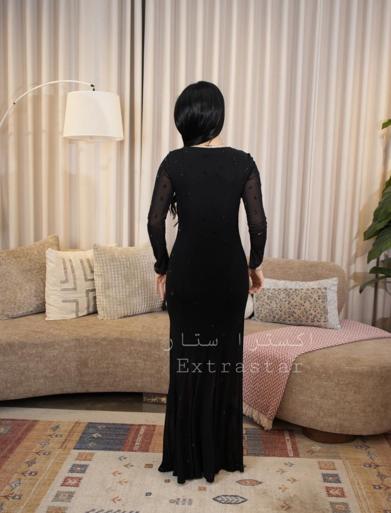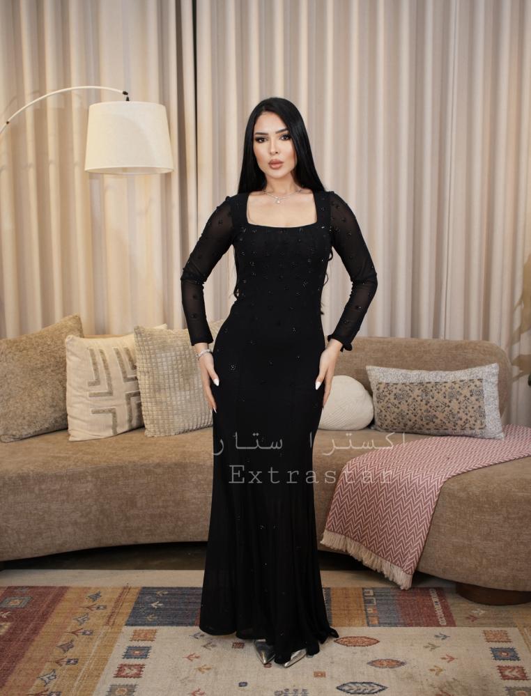 فستان أسود طويل بأكمام شفافه مزين بكرستال