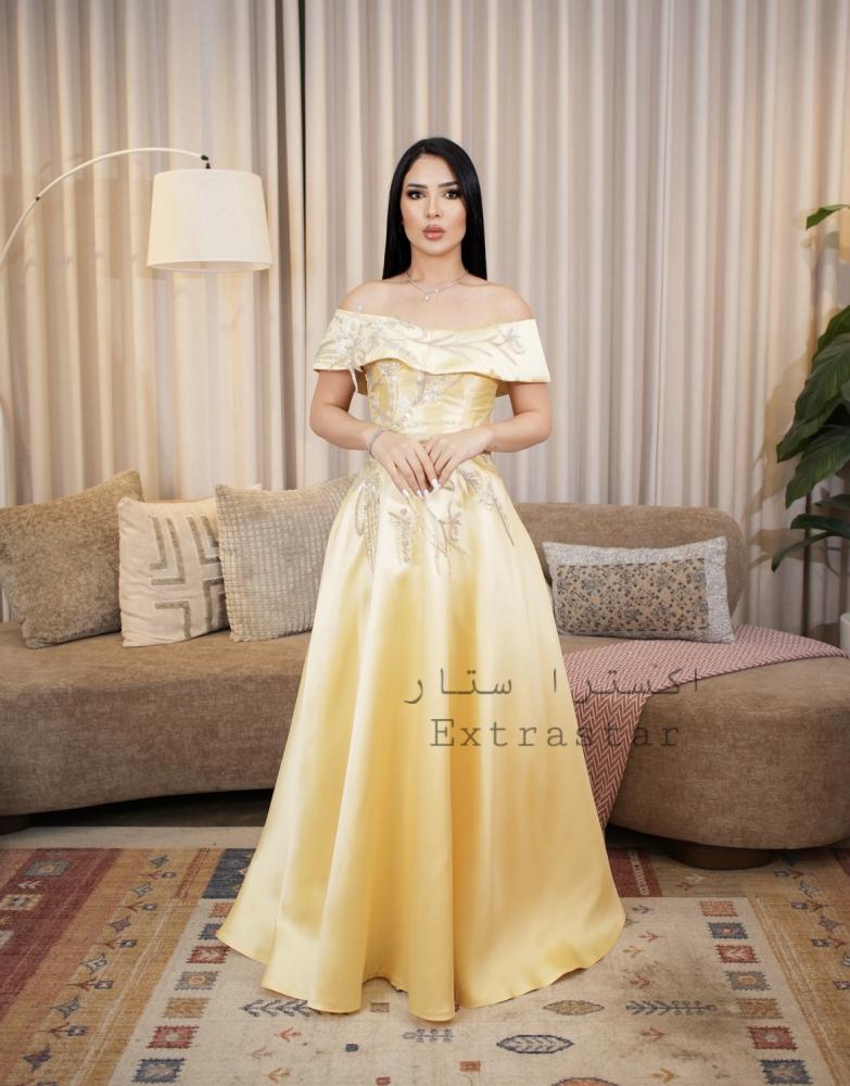 فستان اصفر طويل مزين بخرز وترتر