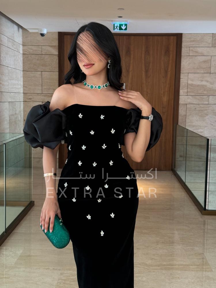 - فستان طويل بقماش مخمل فخم يناسب الإطلالات الفاخرة.