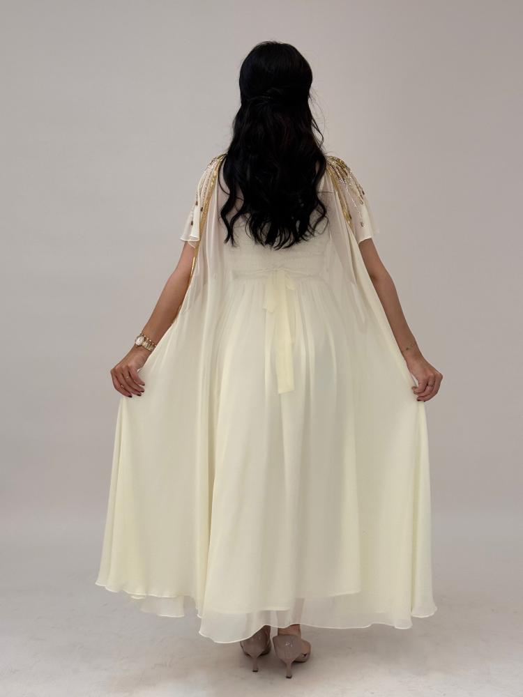 - التفاصيل: جلابية مكونة من طبقتين: طبقة داخلية ناعمة وطبقة شيفون خارجية مزينة بتطريز يدوي.